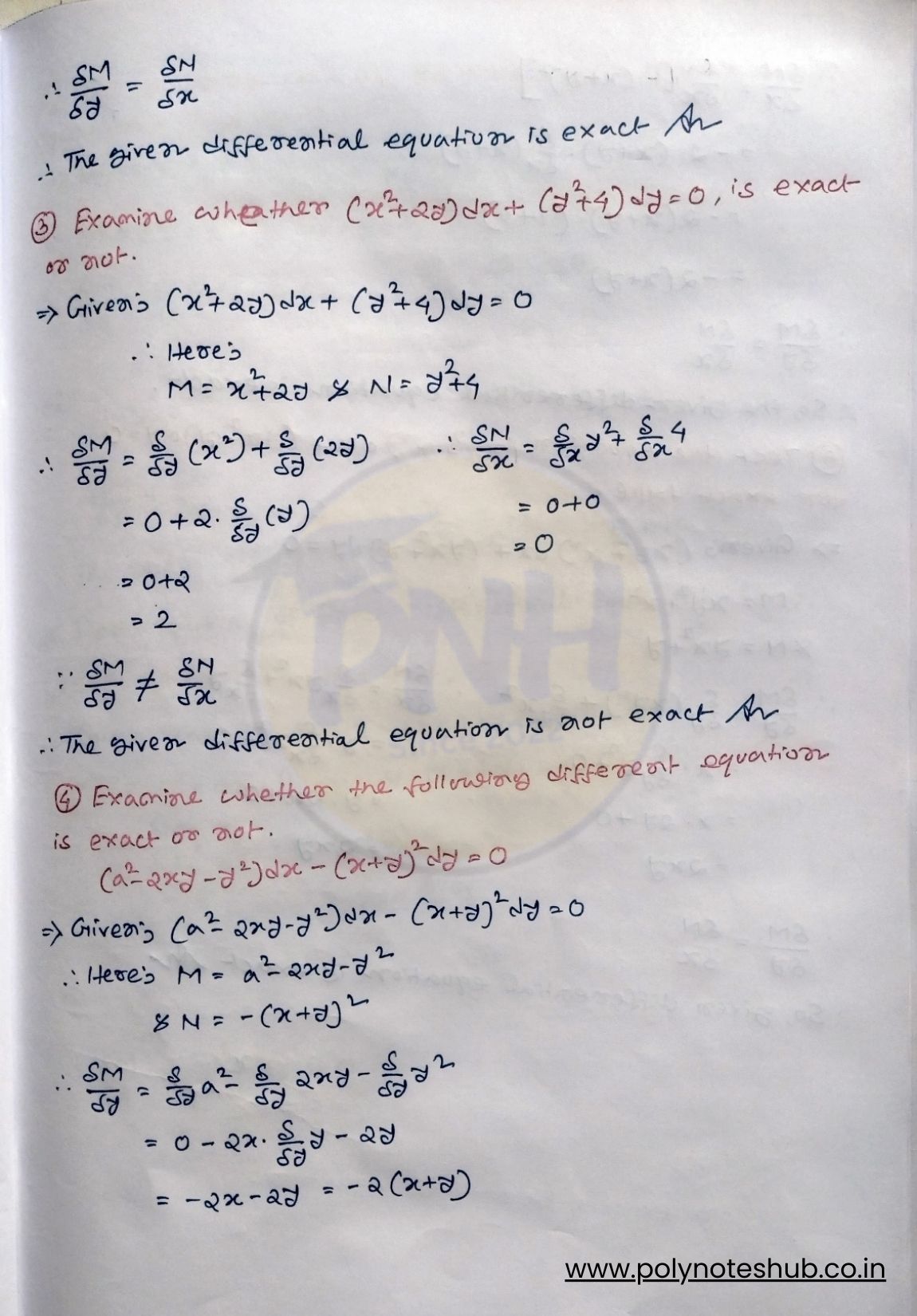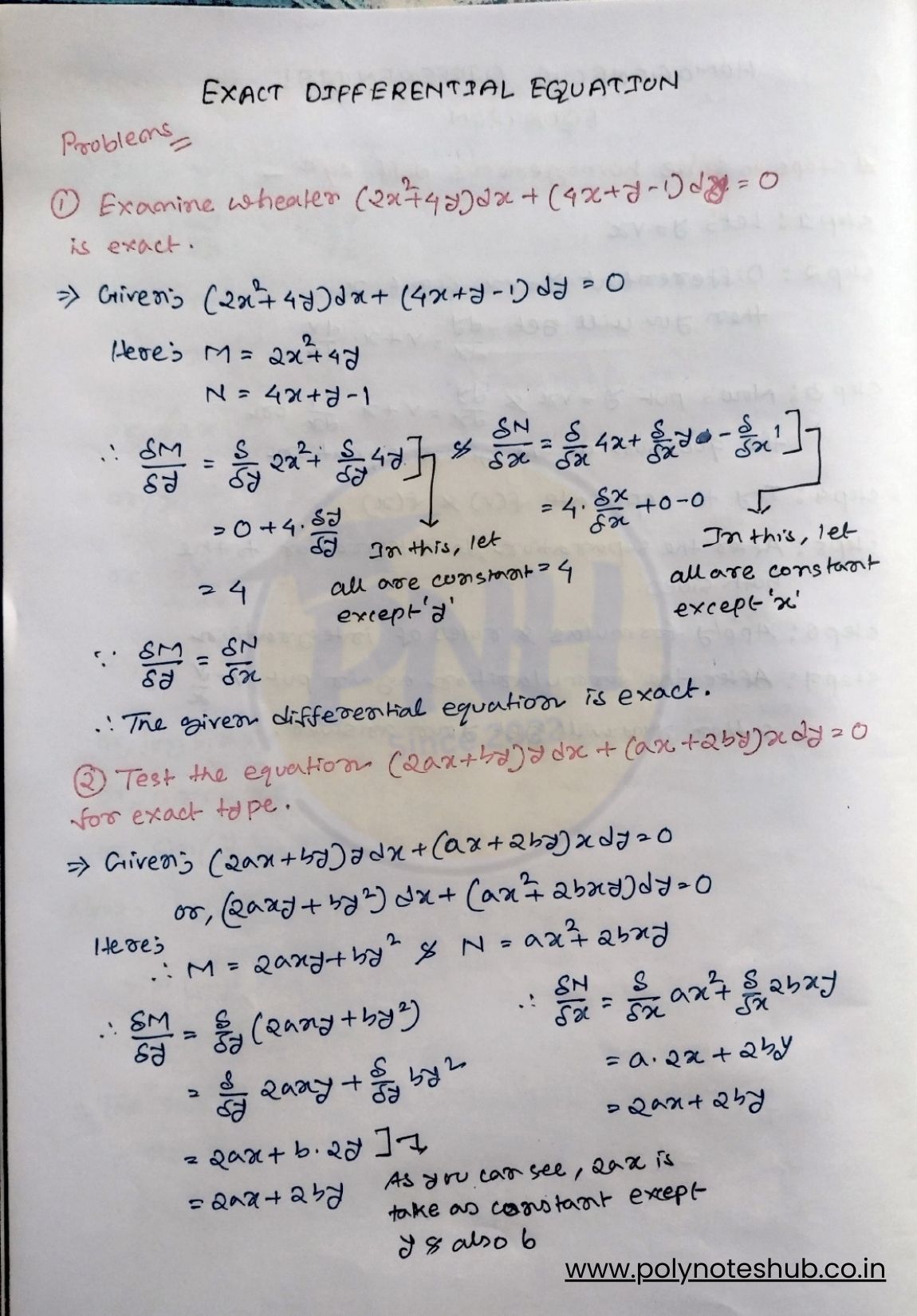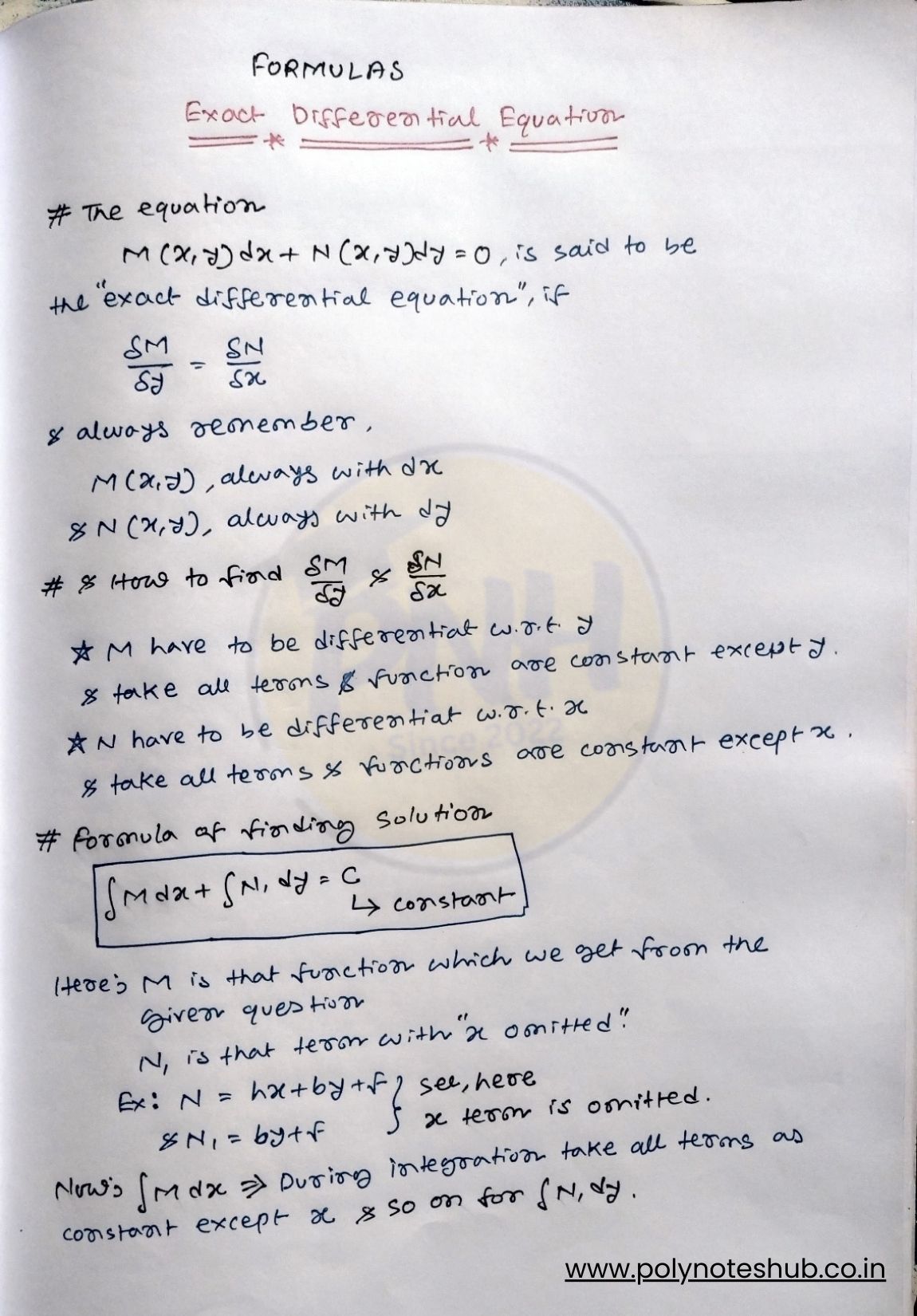 This Exact Differential Equations problems with solutions PDF is specially prepared for Diploma 2nd semester students. These handwritten notes include solved numerical problems, examples, exam questions, and step-by-step answers to help students understand the concept easily. Welcome to Study Notes by Poly Notes Hub, a leading section of Poly Notes Hub’s official website, where you will find diploma and polytechnic engineering notes in PDF format, available in both handwritten and typed versions, at an affordable price.