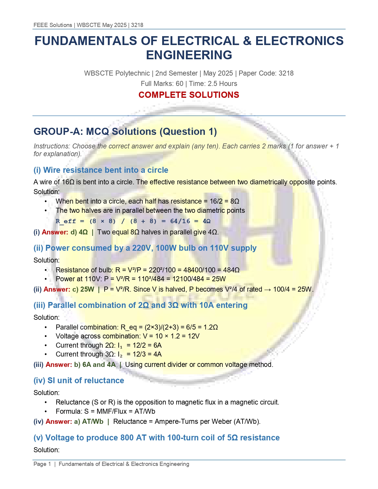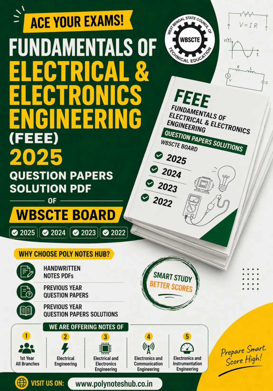 Prepare effectively for your semester exams with this FEEE 2025 question paper solution PDF of WBSCTE Board for Diploma or Polytechnic 2nd Semester Students. This PDF includes complete solutions of real exam questions, covering both electrical and electronics engineering concepts, numerical problems, and theory answers. Each question is solved using a clear step-by-step method, making it easy to understand and revise before exams. This study material is perfect for practice, revision, and improving answer writing skills. Welcome to Study Notes by Poly Notes Hub, a leading section of Poly Notes Hub’s official website, where you will find diploma and polytechnic engineering notes in PDF format, available in both handwritten and typed versions, at an affordable price.